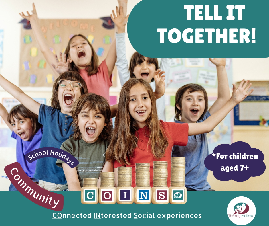 These upcoming holidays our Therapy Matters clients have the opportunity to attend full day group Community COINS sessions delivered by our therapy assistants (with speech pathology support where needed) or our new 2.5hour Speech Pathology Lead Story-Telling Groups.
